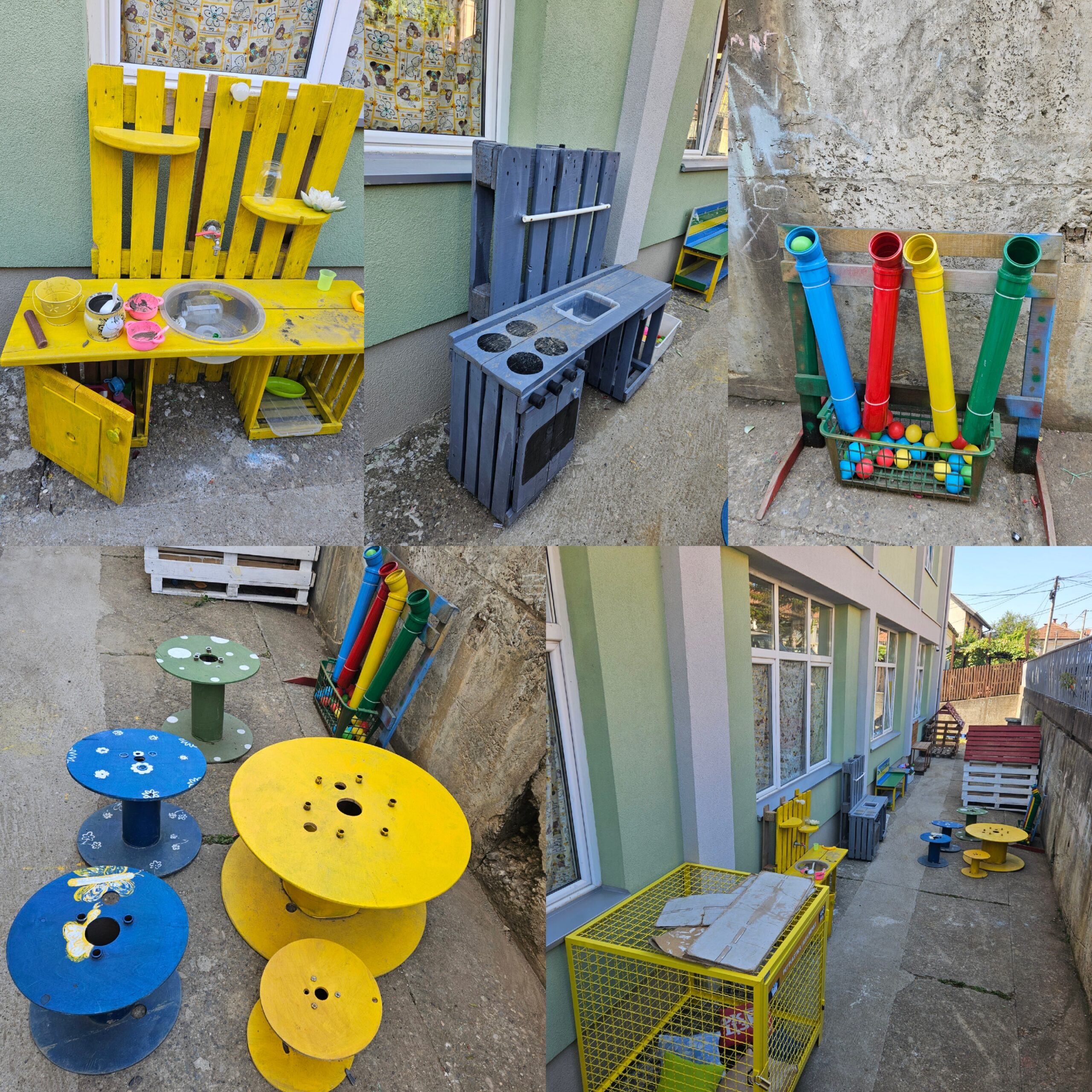 Том приликом направљени су нови реквизити од гума, палета и летвица, са различитим наменама за игру. Обновљене су и зелене површине — обликовањем садница стабала и садњом разноврсног сезонског цвећа.